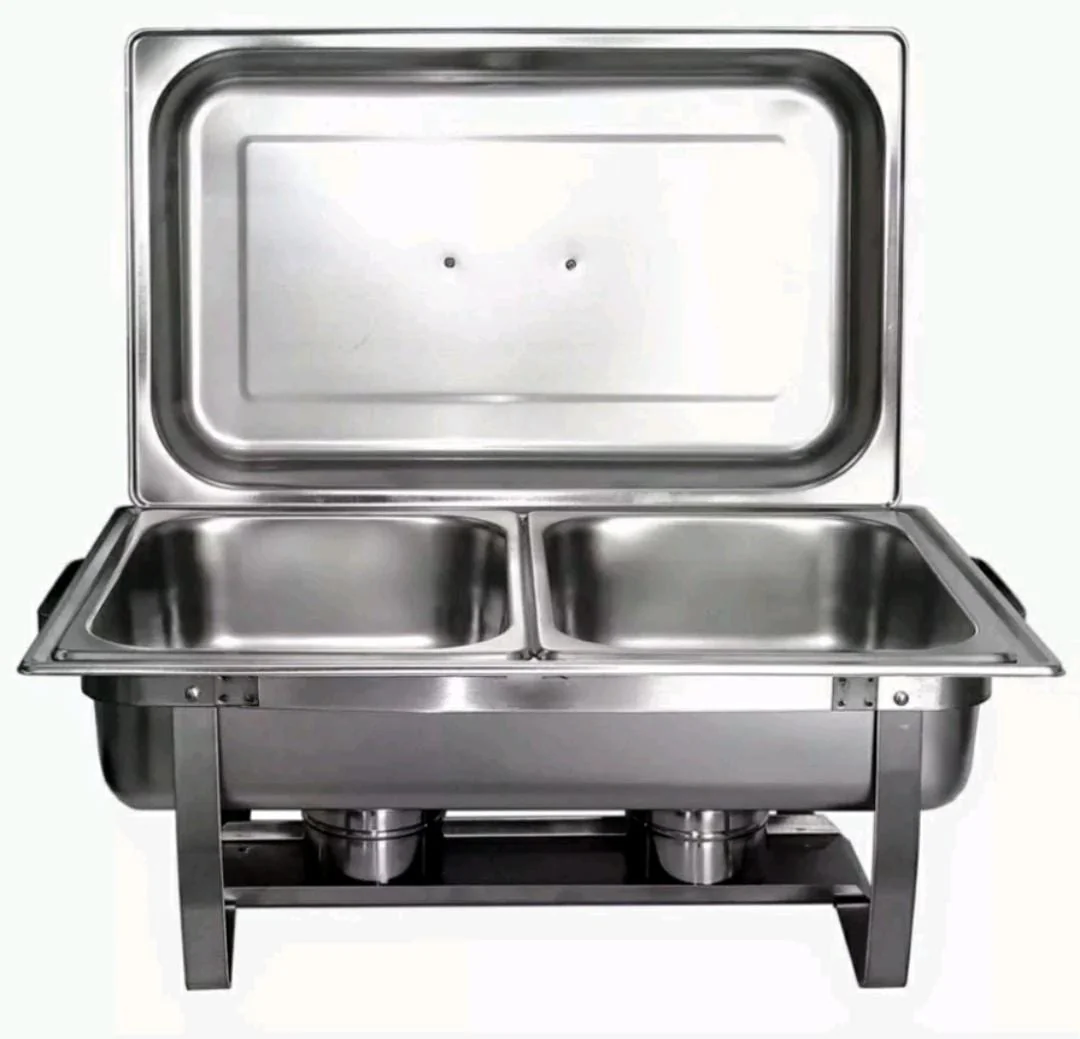 aparelho usado para manter alimentos aquecidos, ideal para buffet, eventos ou jantares. Cor cromado. Fabricada em inox. 2 cubas- 9 litros.